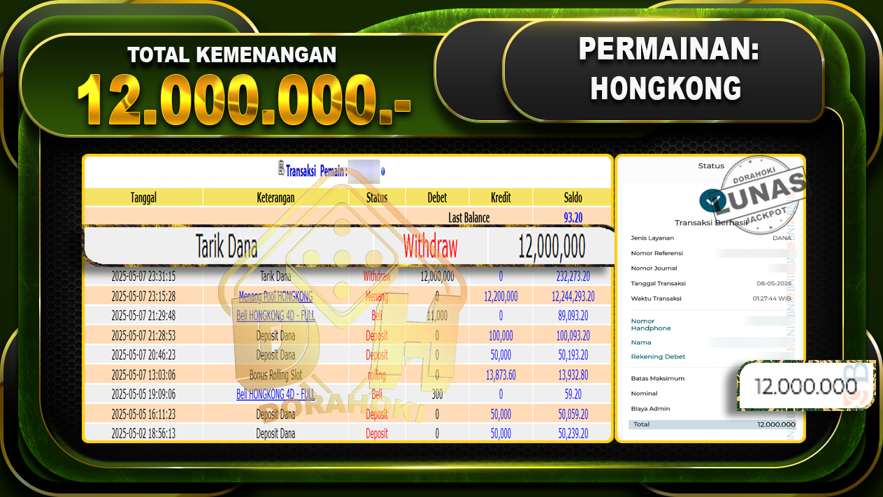 Bukti JP TOGEL HONGKONG – ucapkan selamat kepada user id Sunxxx atas kemenangan di  TOGEL HONGKONG  dengan total kemenangan Rp 12.000.000,- . Yang pasti nya langsung LUNAS sesuai bukti ya bosku. Dorahoki nih bosku berapapun akan tetap kami bayar lunas ya bosku.