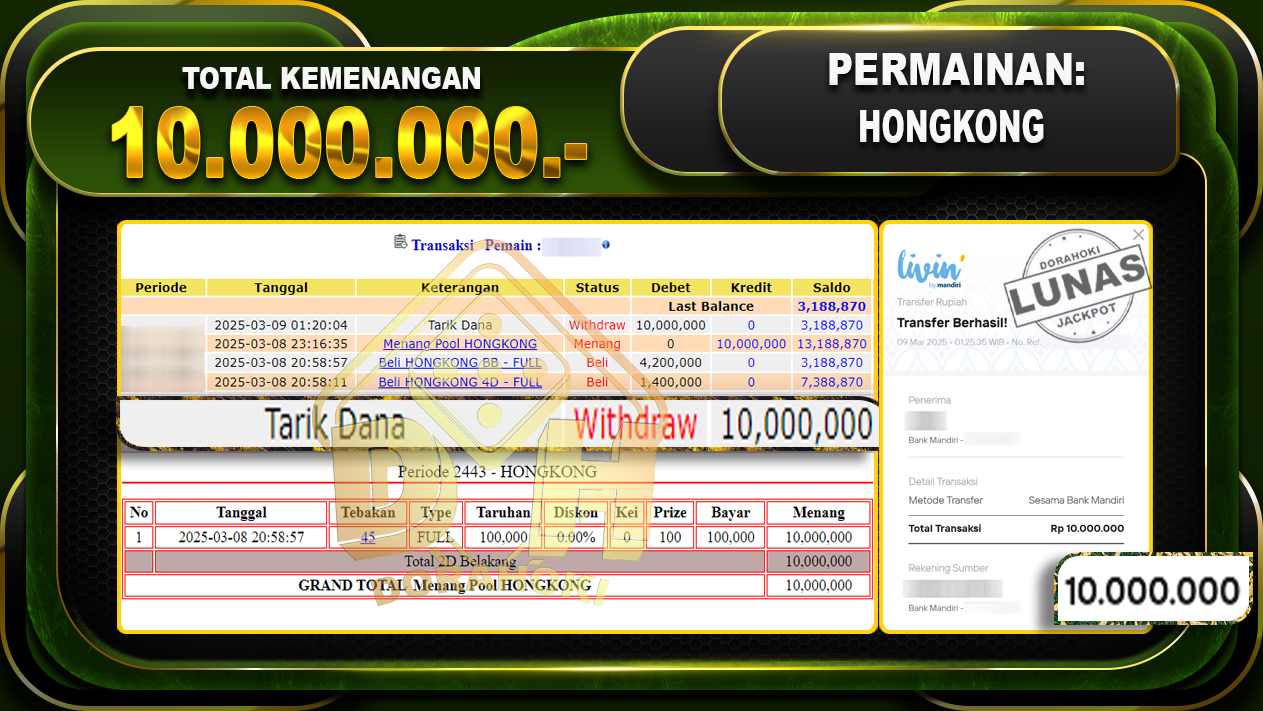 Bukti JP TOGEL HONGKONG – ucapkan selamat kepada user id Gulxxx atas kemenangan di  TOGEL HONGKONG  dengan total kemenangan Rp.10.000.000,- . Yang pasti nya langsung LUNAS sesuai bukti ya bosku. Dorahoki nih bosku berapapun akan tetap kami bayar lunas ya bosku.