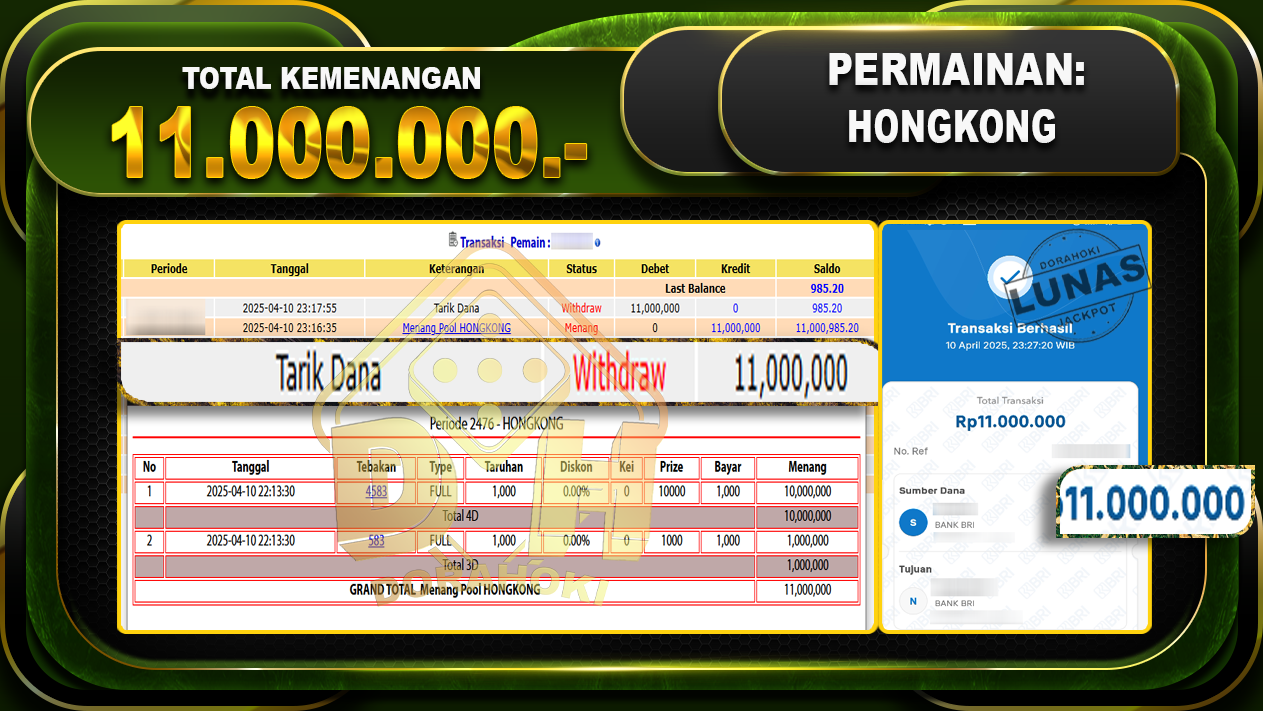 Bukti JP TOGEL HONGKONG – ucapkan selamat kepada user id Samxxx atas kemenangan di TOGEL HONGKONG dengan total kemenangan Rp11.000.000,- . Yang pasti nya langsung LUNAS sesuai bukti ya bosku. Dorahoki nih bosku berapapun akan tetap kami bayar lunas ya bosku.