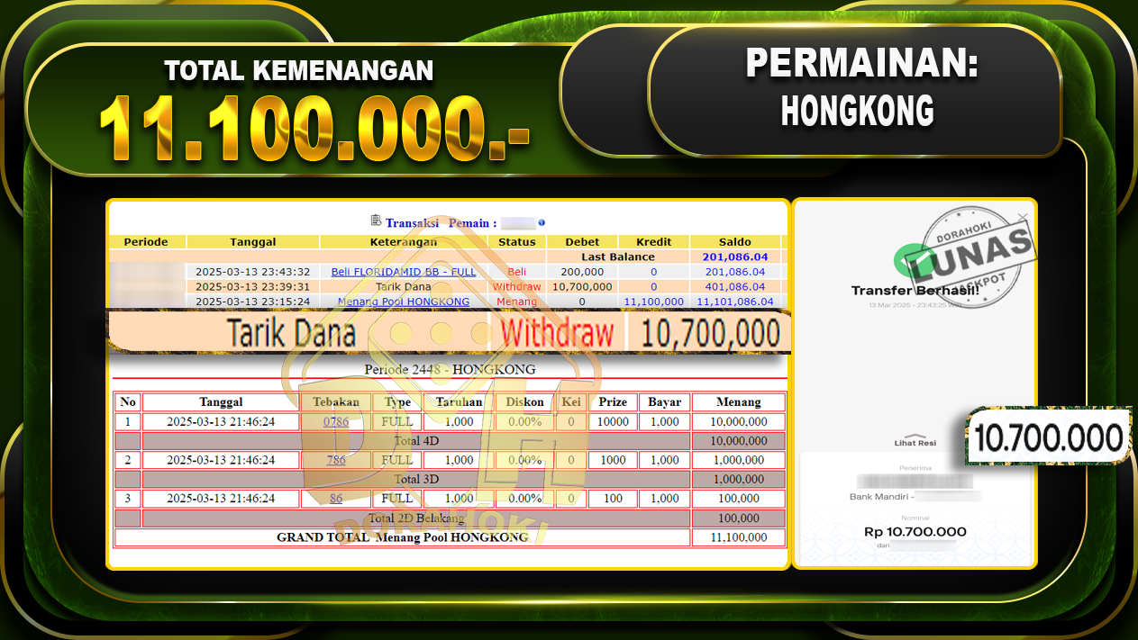 Bukti JP TOGEL HONGKONG – ucapkan selamat kepada user id Udixxx atas kemenangan di TOGEL HONGKONG dengan total kemenangan Rp.11.100.000,- . Yang pasti nya langsung LUNAS sesuai bukti ya bosku. Dorahoki nih bosku berapapun akan tetap kami bayar lunas ya bosku.