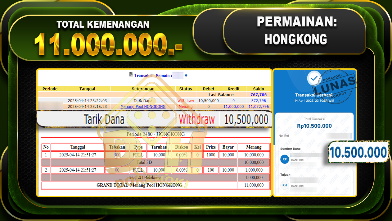 Bukti JP TOGEL HONGKONG – ucapkan selamat kepada user id Fatxxx atas kemenangan di TOGEL HONGKONG dengan total kemenangan Rp11.000.000,- . Yang pasti nya langsung LUNAS sesuai bukti ya bosku. Dorahoki nih bosku berapapun akan tetap kami bayar lunas ya bosku.
