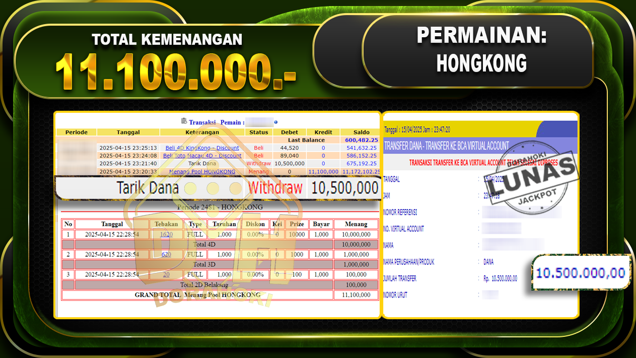 Bukti JP TOGEL HONGKONG – ucapkan selamat kepada user id Budxxx atas kemenangan di  TOGEL HONGKONG  dengan total kemenangan Rp11.100.000,- . Yang pasti nya langsung LUNAS sesuai bukti ya bosku. Dorahoki nih bosku berapapun akan tetap kami bayar lunas ya bosku.