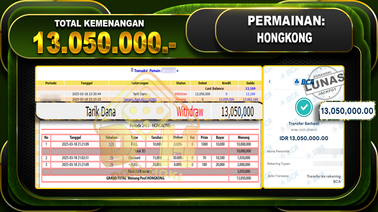Bukti JP TOGEL HONGKONG – ucapkan selamat kepada user id Kisxxx atas kemenangan di TOGEL HONGKONG dengan total kemenangan Rp.13.050.000,- . Yang pasti nya langsung LUNAS sesuai bukti ya bosku. Dorahoki nih bosku berapapun akan tetap kami bayar lunas ya bosku.