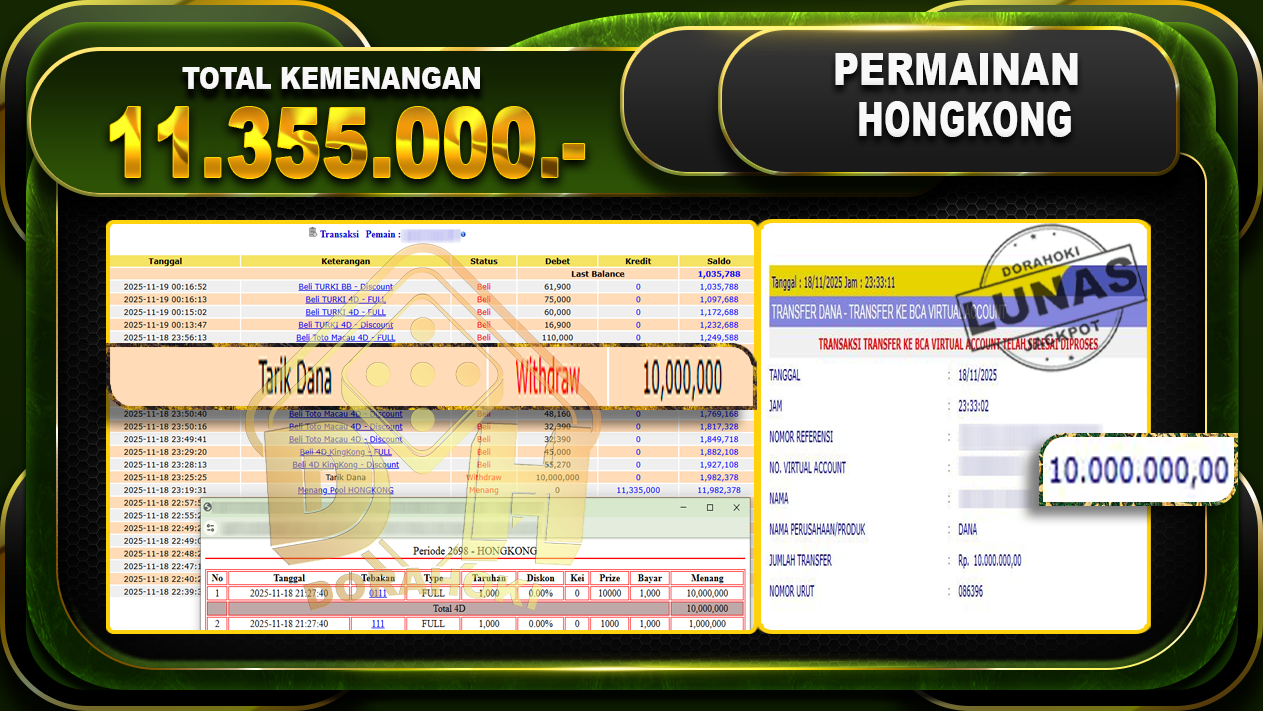 Bukti JP TOGEL HONGKONG – ucapkan selamat kepada user id pepxxxxx atas kemenangan di TOGEL HONGKONG dengan total kemenangan Rp.11,355,000,- . Yang pasti nya langsung LUNAS sesuai bukti ya bosku. Dorahoki nih bosku berapapun akan tetap kami bayar lunas ya bosku.