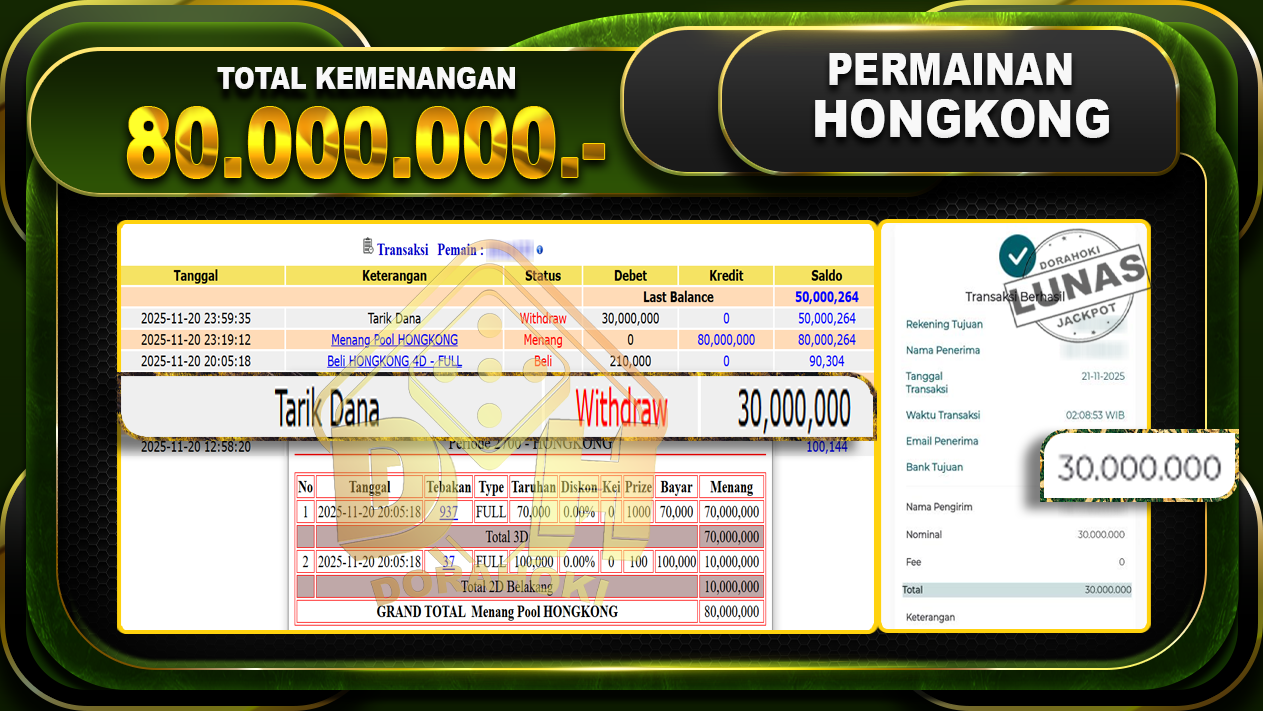 Bukti JP TOGEL HONGKONG – ucapkan selamat kepada user id afrxxxxx atas kemenangan di TOGEL HONGKONG dengan total kemenangan Rp.80,000,000,- . Yang pasti nya langsung LUNAS sesuai bukti ya bosku. Dorahoki nih bosku berapapun akan tetap kami bayar lunas ya bosku.