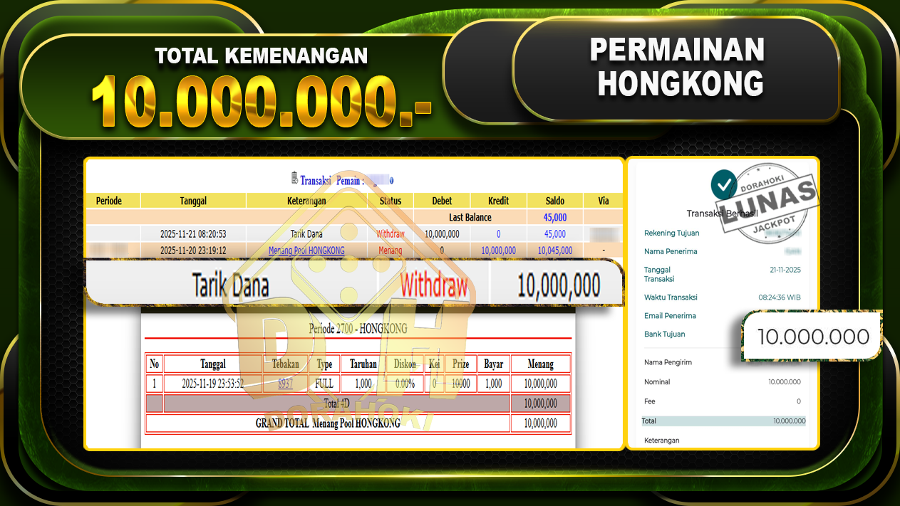 Bukti JP TOGEL HONGKONG – ucapkan selamat kepada user id sugxxxxx atas kemenangan di TOGEL HONGKONG dengan total kemenangan Rp.10,000,000,- . Yang pasti nya langsung LUNAS sesuai bukti ya bosku. Dorahoki nih bosku berapapun akan tetap kami bayar lunas ya bosku.