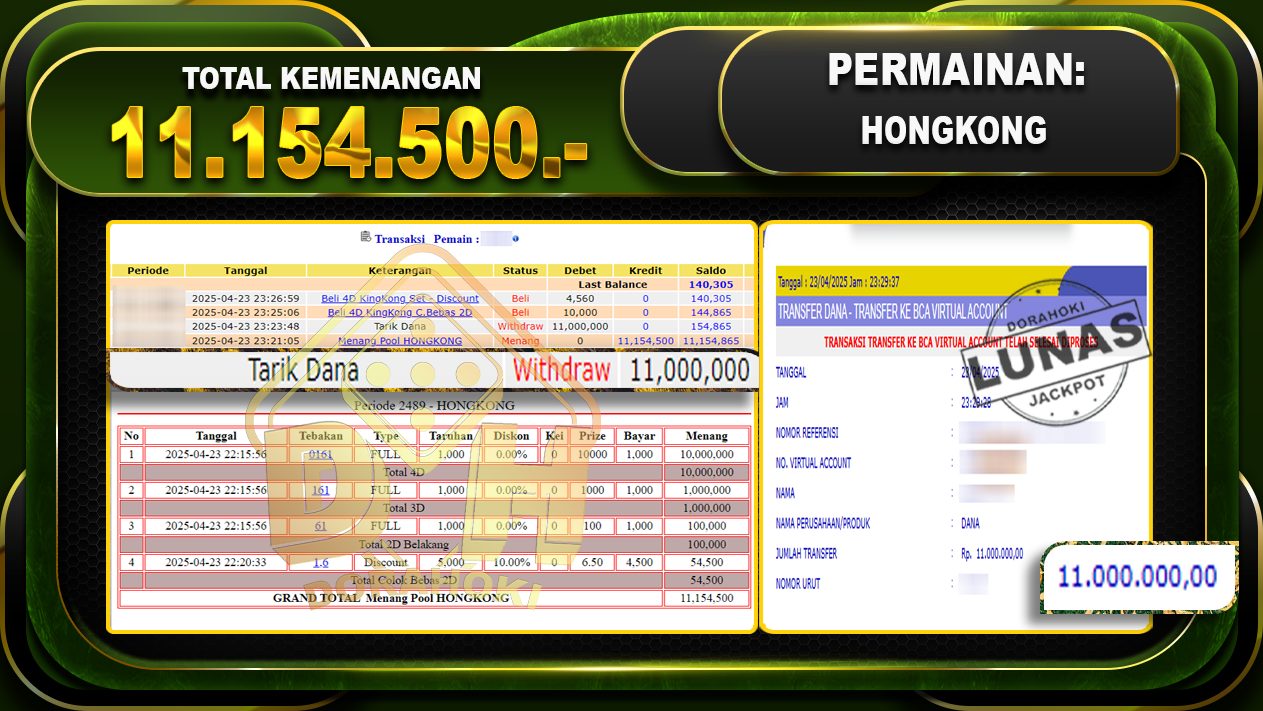 Bukti JP TOGEL HONGKONG – ucapkan selamat kepada user id Zioxxx atas kemenangan di  TOGEL HONGKONG  dengan total kemenangan Rp 11.154.500,- . Yang pasti nya langsung LUNAS sesuai bukti ya bosku. Dorahoki nih bosku berapapun akan tetap kami bayar lunas ya bosku.
