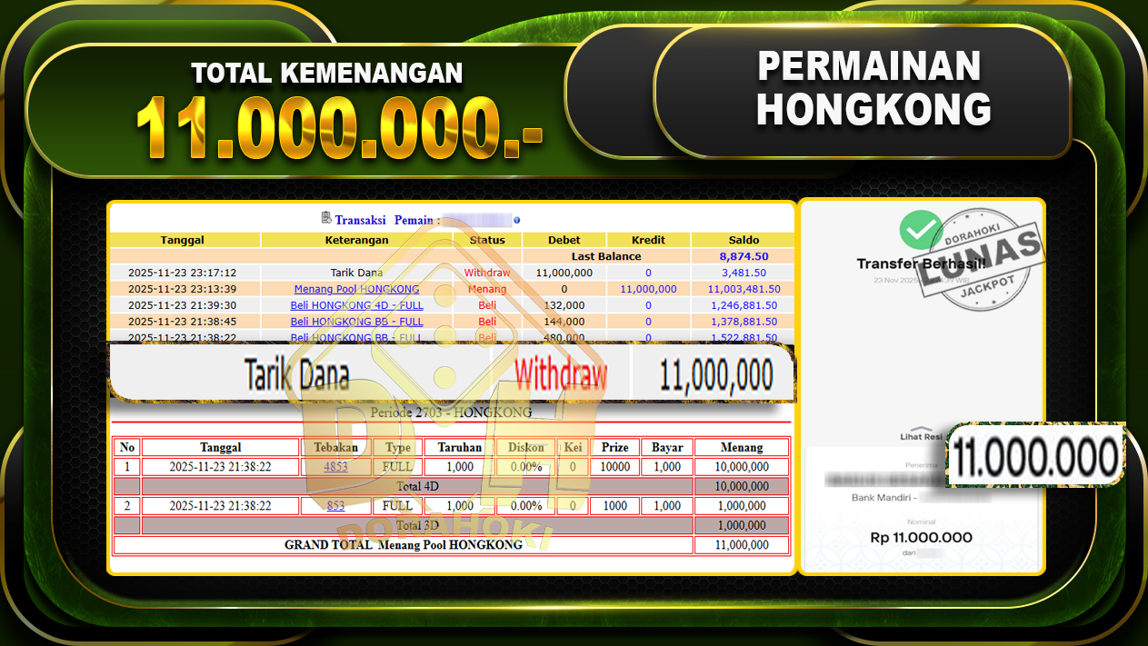Bukti JP TOGEL HONGKONG – ucapkan selamat kepada user id bagxxxxx atas kemenangan di TOGEL HONGKONG dengan total kemenangan Rp.11,000,000,- . Yang pasti nya langsung LUNAS sesuai bukti ya bosku. Dorahoki nih bosku berapapun akan tetap kami bayar lunas ya bosku.