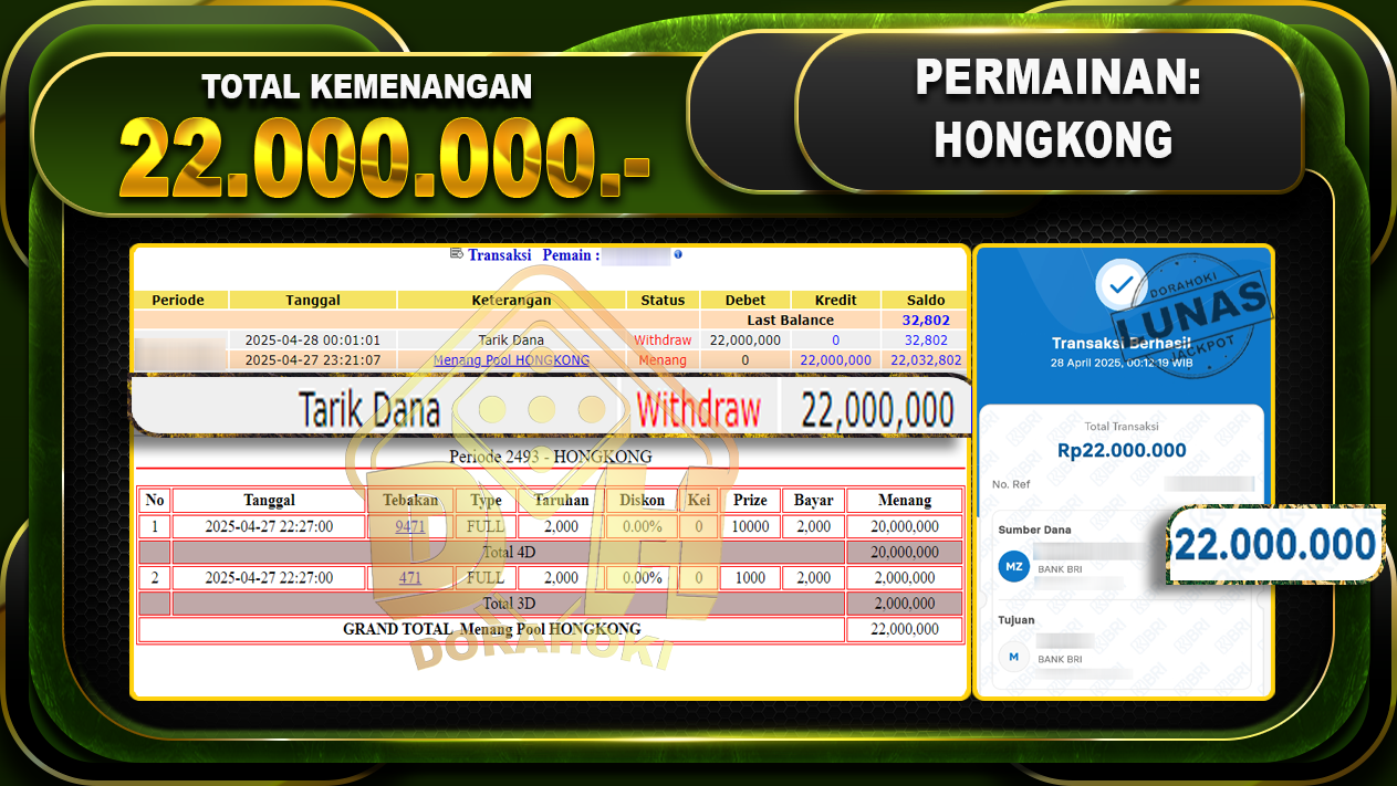 Bukti JP TOGEL HONGKONG – ucapkan selamat kepada user id Masxxx atas kemenangan di TOGEL HONGKONG dengan total kemenangan Rp 22.000.000,- . Yang pasti nya langsung LUNAS sesuai bukti ya bosku. Dorahoki nih bosku berapapun akan tetap kami bayar lunas ya bosku.