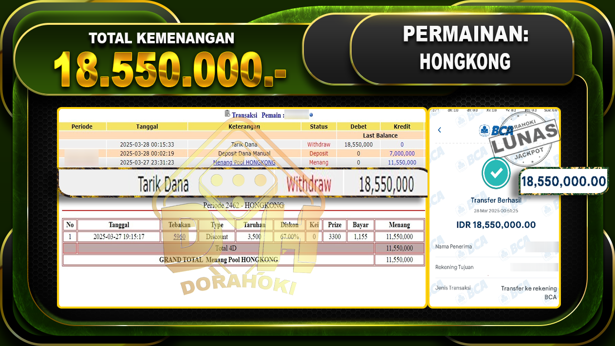 Bukti JP TOGEL HONGKONG – ucapkan selamat kepada user id Bocxxx atas kemenangan di TOGEL HONGKONG dengan total kemenangan Rp18.550.000,- . Yang pasti nya langsung LUNAS sesuai bukti ya bosku. Dorahoki nih bosku berapapun akan tetap kami bayar lunas ya bosku.