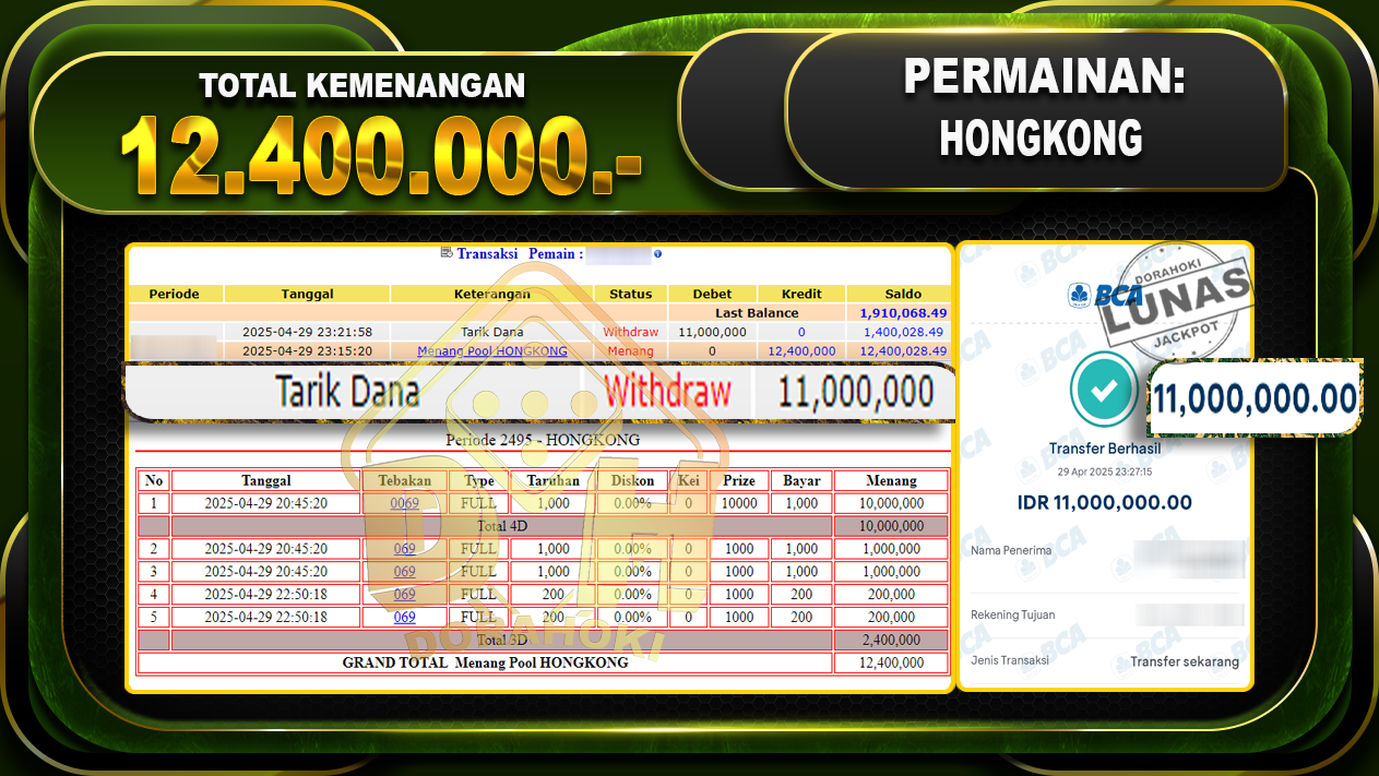Bukti JP TOGEL HONGKONG – ucapkan selamat kepada user id Ganxxx atas kemenangan di TOGEL HONGKONG dengan total kemenangan Rp 12.400.000,- . Yang pasti nya langsung LUNAS sesuai bukti ya bosku. Dorahoki nih bosku berapapun akan tetap kami bayar lunas ya bosku.