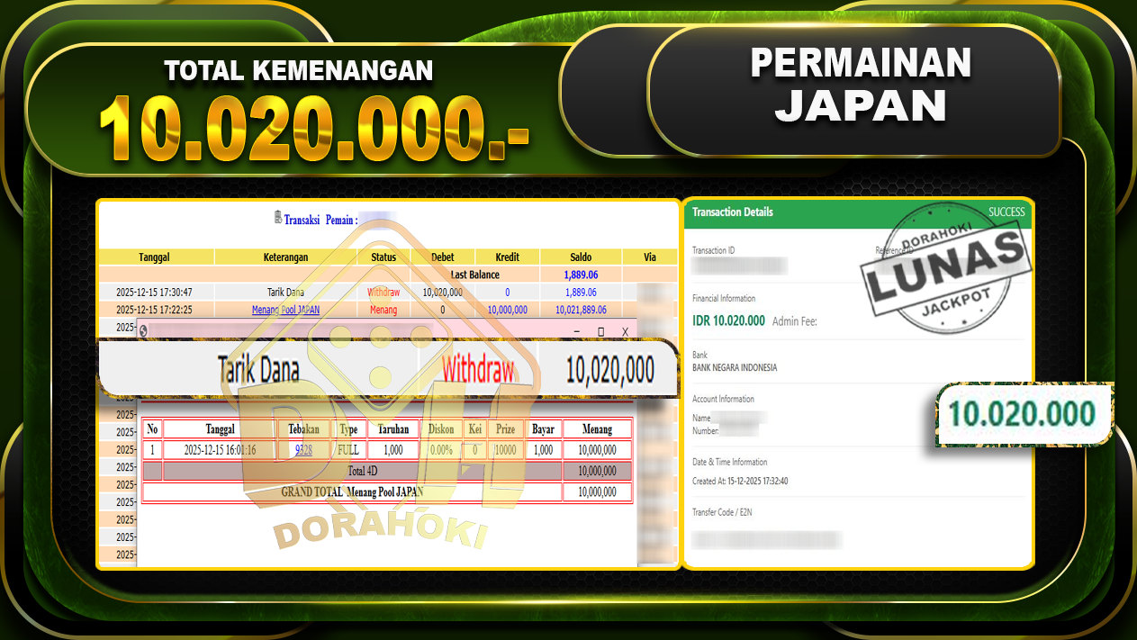 Bukti JP TOGEL JAPAN – ucapkan selamat kepada user id jawxxx atas kemenangan di TOGEL JAPAN dengan total kemenangan Rp.10.020.000,- Yang pasti nya langsung LUNAS sesuai bukti ya bosku. Dorahoki nih bosku berapapun akan tetap kami bayar lunas ya bosku