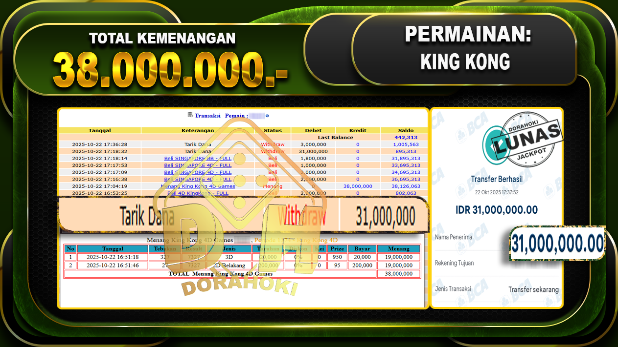 Bukti JP TOGEL KING KONG 4D – ucapkan selamat kepada user id busxxx atas kemenangan di TOGEL KING KONG 4D dengan total kemenangan Rp.38,000,000,- Yang pasti nya langsung LUNAS sesuai bukti ya bosku. Dorahoki nih bosku berapapun akan tetap kami bayar lunas ya bosku