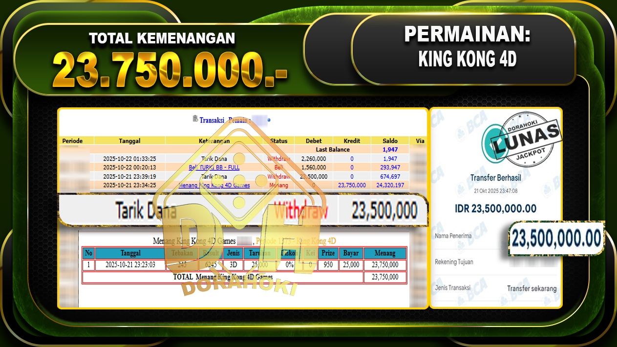 Bukti JP TOGEL KING KONG 4D – ucapkan selamat kepada user id busxxx atas kemenangan di TOGEL KING KONG 4D dengan total kemenangan Rp.23,750,000,- Yang pasti nya langsung LUNAS sesuai bukti ya bosku. Dorahoki nih bosku berapapun akan tetap kami bayar lunas ya bosku