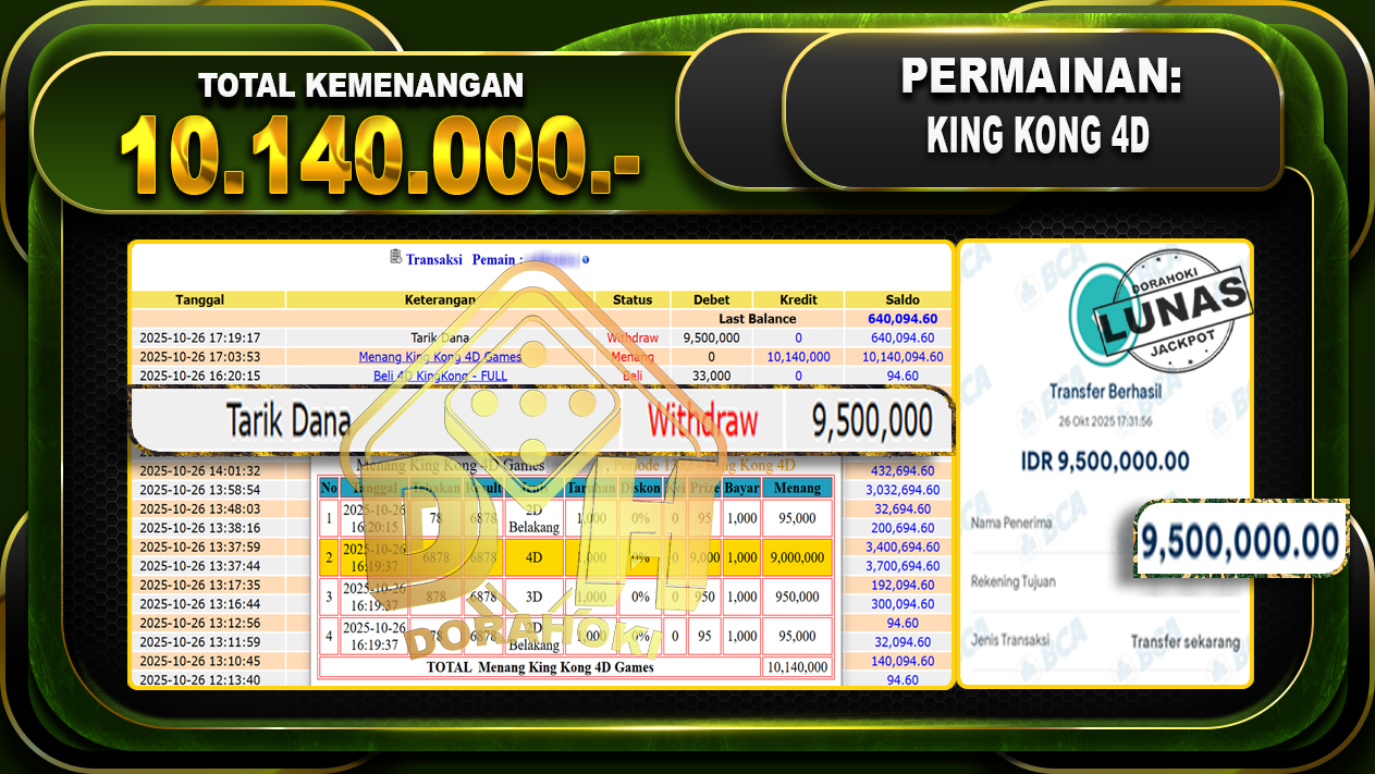 Bukti JP TOGEL KING KONG 4D – ucapkan selamat kepada user id adixxxxx atas kemenangan di TOGEL KING KONG 4D dengan total kemenangan Rp.10,140,000,- Yang pasti nya langsung LUNAS sesuai bukti ya bosku. Dorahoki nih bosku berapapun akan tetap kami bayar lunas ya bosku
