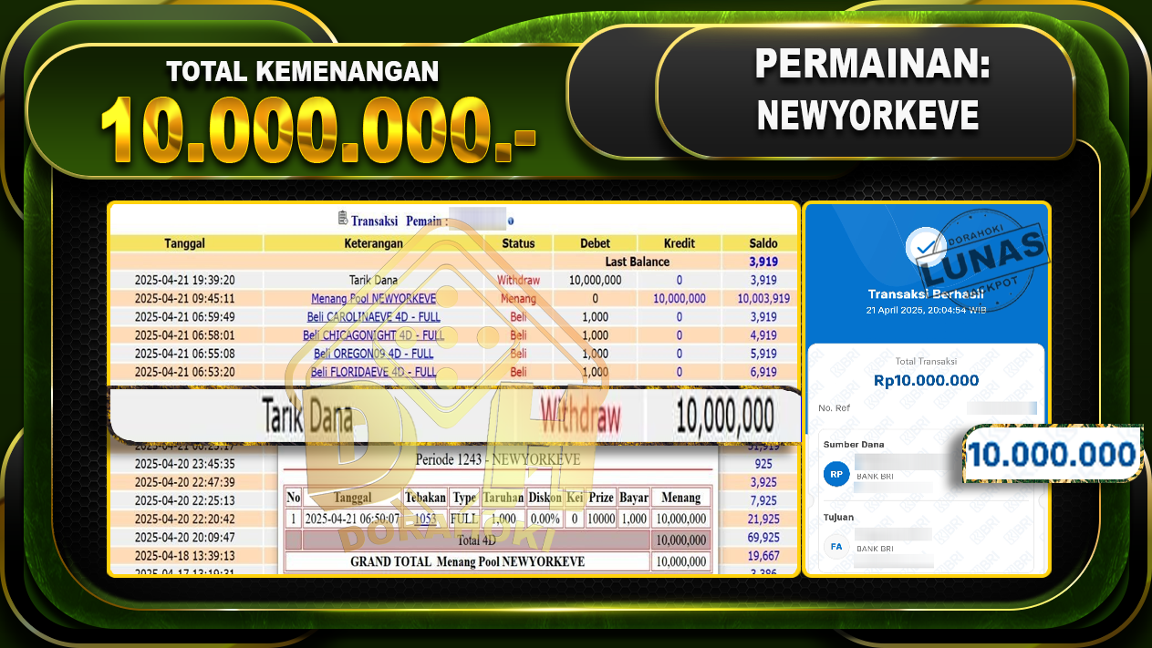 Bukti JP TOGEL NEWYORKEVE – ucapkan selamat kepada user id Fadxxx atas kemenangan di TOGEL NEWYORKEVE dengan total kemenangan Rp.10.000.000,- . Yang pasti nya langsung LUNAS sesuai bukti ya bosku. Dorahoki nih bosku berapapun akan tetap kami bayar lunas ya bosku.