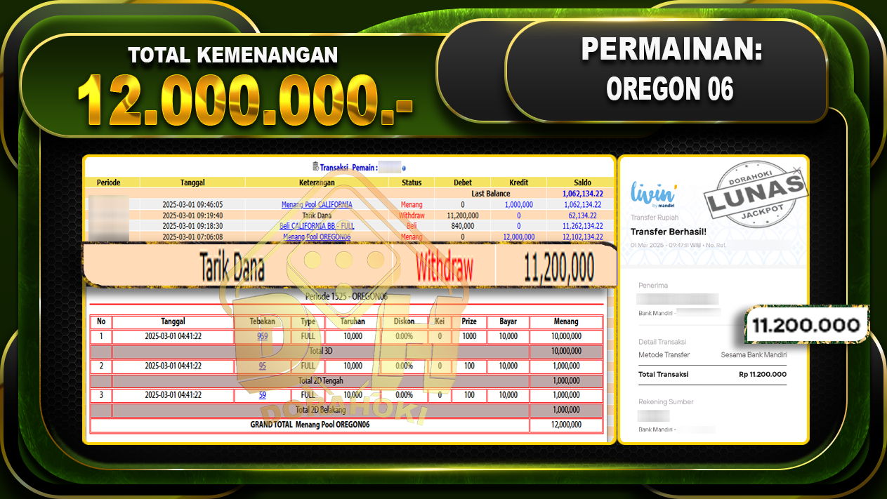 Bukti JP TOGEL OREGON 06 – ucapkan selamat kepada user id Harxxx atas kemenangan di TOGEL OREGON 06 dengan total kemenangan Rp.12.000.000,- . Yang pasti nya langsung LUNAS sesuai bukti ya bosku. Dorahoki nih bosku berapapun akan tetap kami bayar lunas ya bosku.