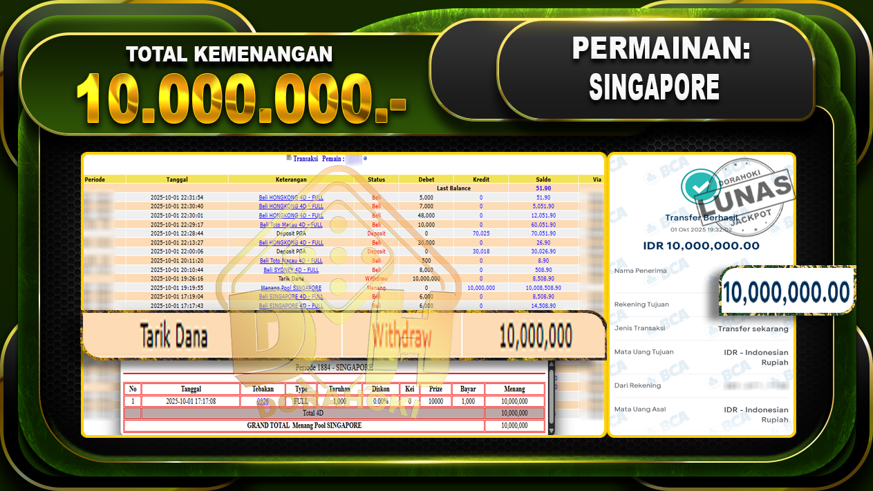 Bukti JP TOGEL SINGAPORE – ucapkan selamat kepada user id ojoxxx atas kemenangan di TOGEL SINGAPORE dengan total kemenangan Rp.10,000,000,- Yang pasti nya langsung LUNAS sesuai bukti ya bosku. Dorahoki nih bosku berapapun akan tetap kami bayar lunas ya bosku