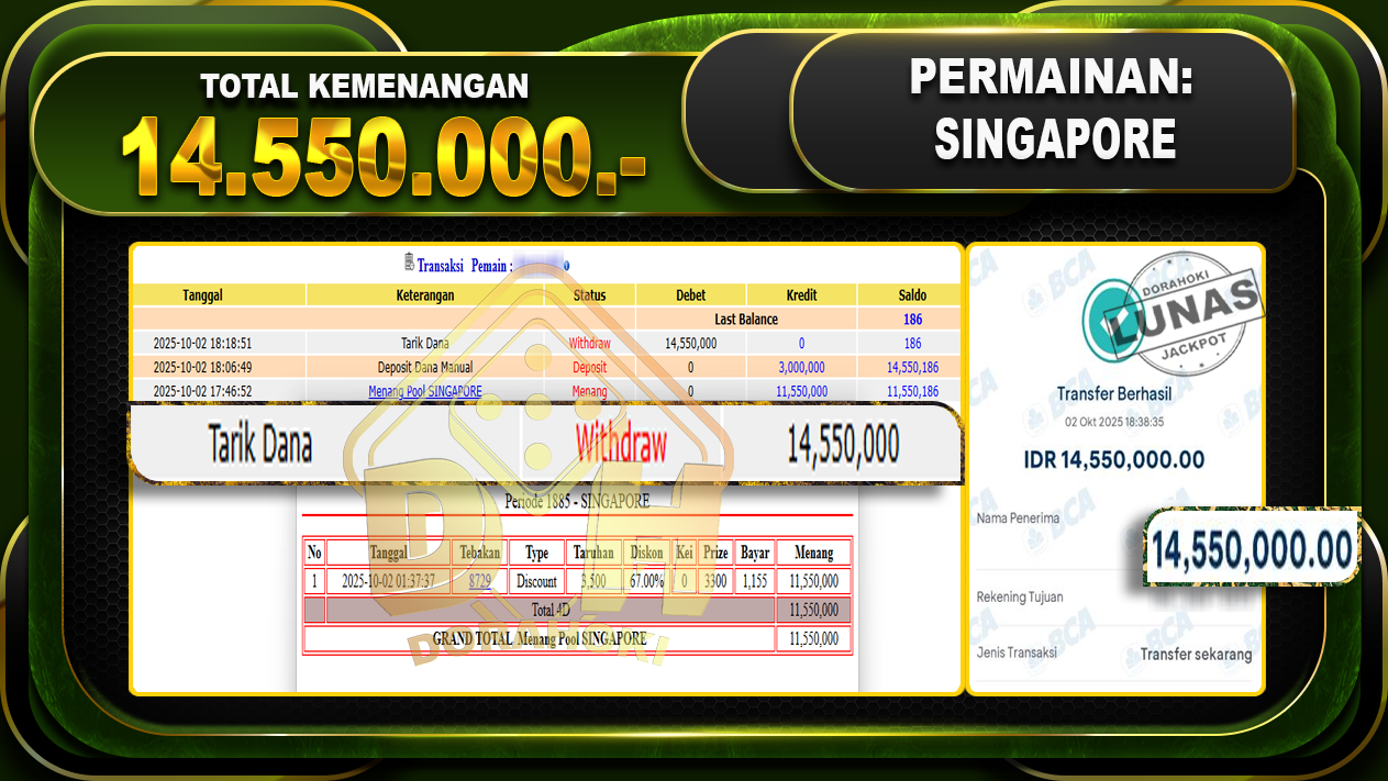 Bukti JP TOGEL SINGAPORE – ucapkan selamat kepada user id 4maxxxxx atas kemenangan di TOGEL SINGAPORE dengan total kemenangan Rp.14,550,000,- Yang pasti nya langsung LUNAS sesuai bukti ya bosku. Dorahoki nih bosku berapapun akan tetap kami bayar lunas ya bosku