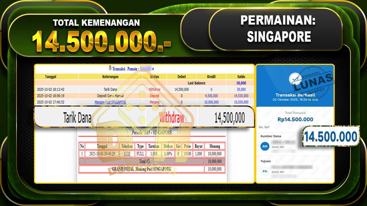 Bukti JP TOGEL SINGAPORE – ucapkan selamat kepada user id bladxxxxx atas kemenangan di TOGEL SINGAPORE dengan total kemenangan Rp.14,500,000,- Yang pasti nya langsung LUNAS sesuai bukti ya bosku. Dorahoki nih bosku berapapun akan tetap kami bayar lunas ya bosku