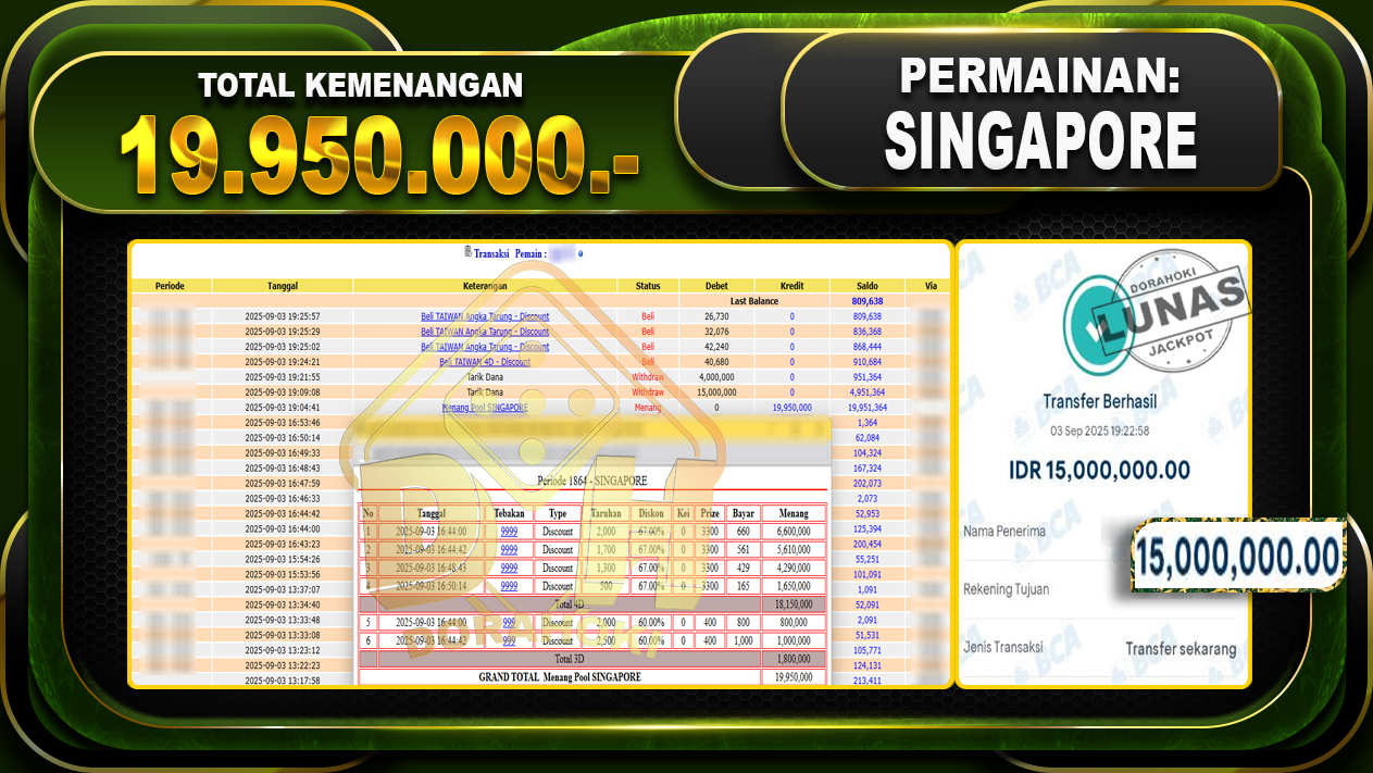 Bukti JP TOGEL SINGAPORE – ucapkan selamat kepada user id Sigxxxxx atas kemenangan di  TOGEL SINGAPORE dengan total kemenangan Rp.19,950,000,- Yang pasti nya langsung LUNAS sesuai bukti ya bosku. Dorahoki nih bosku berapapun akan tetap kami bayar lunas ya bosku