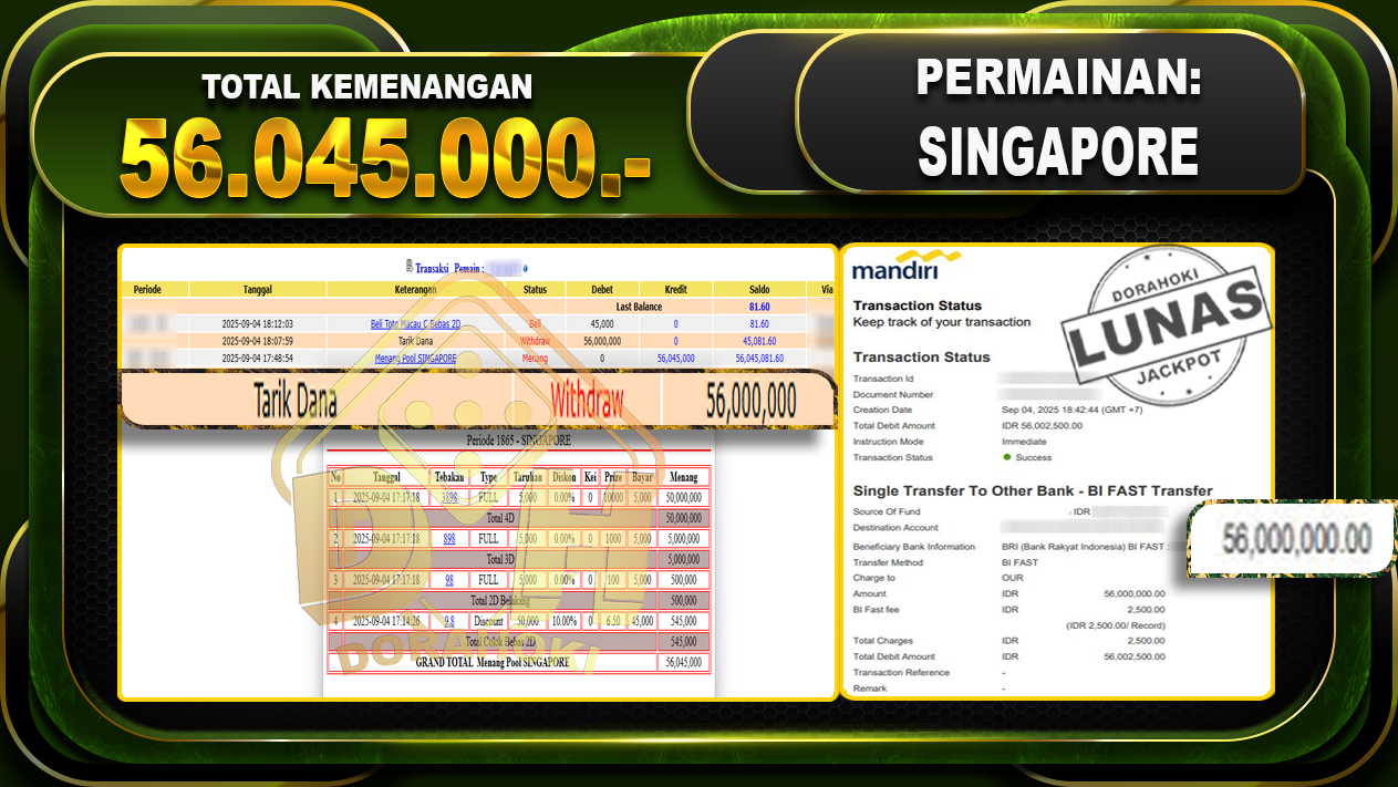 Bukti JP TOGEL SINGAPORE – ucapkan selamat kepada user id Wajxxxxxx atas kemenangan di  TOGEL SINGAPORE dengan total kemenangan Rp.56,045,000,- Yang pasti nya langsung LUNAS sesuai bukti ya bosku. Dorahoki nih bosku berapapun akan tetap kami bayar lunas ya bosku
