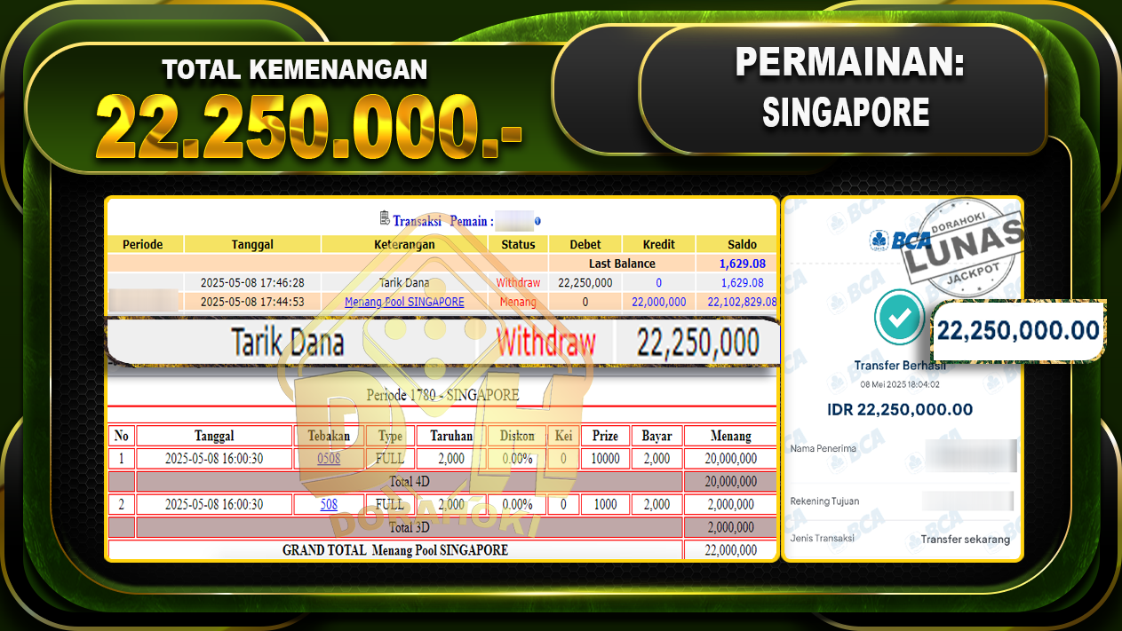 Bukti JP TOGEL SINGAPORE – ucapkan selamat kepada user id Aurxxx atas kemenangan di  TOGEL SINGAPORE  dengan total kemenangan Rp.22.250.000,- . Yang pasti nya langsung LUNAS sesuai bukti ya bosku. Dorahoki nih bosku berapapun akan tetap kami bayar lunas ya bosku.