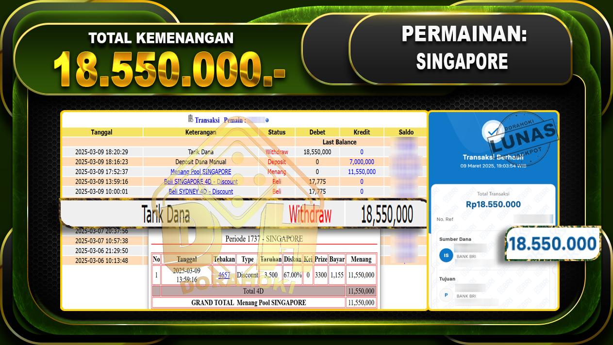 Bukti JP TOGEL SINGAPORE – ucapkan selamat kepada user id Cikxxx atas kemenangan di  TOGEL SINGAPORE  dengan total kemenangan Rp.18.550.000,- . Yang pasti nya langsung LUNAS sesuai bukti ya bosku. Dorahoki nih bosku berapapun akan tetap kami bayar lunas ya bosku.