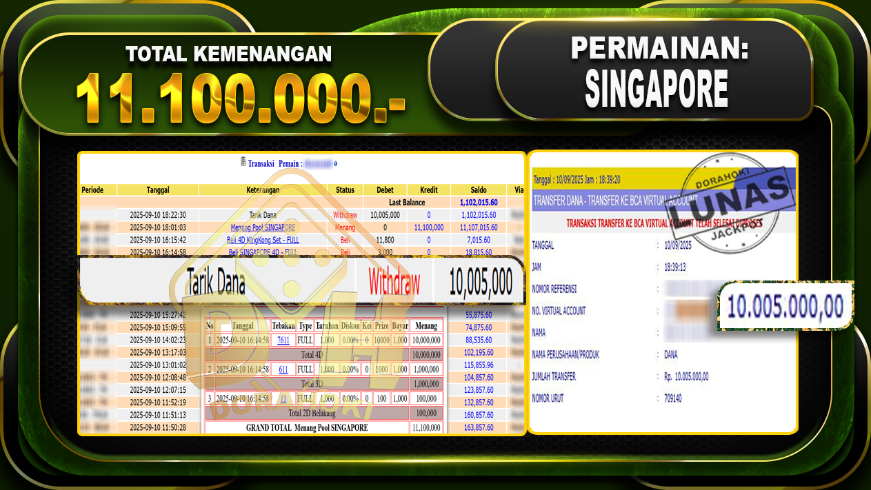 Bukti JP TOGEL SINGAPORE – ucapkan selamat kepada user id Ekaxxxx atas kemenangan di  TOGEL SINGAPORE dengan total kemenangan Rp.11,100,000,- Yang pasti nya langsung LUNAS sesuai bukti ya bosku. Dorahoki nih bosku berapapun akan tetap kami bayar lunas ya bosku