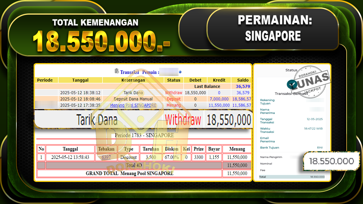 Bukti JP TOGEL SINGAPORE – ucapkan selamat kepada user id Krixxx atas kemenangan di TOGEL SINGAPORE dengan total kemenangan Rp.18.550.000,- . Yang pasti nya langsung LUNAS sesuai bukti ya bosku. Dorahoki nih bosku berapapun akan tetap kami bayar lunas ya bosku.