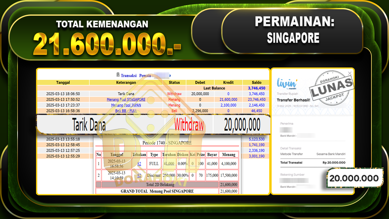 Bukti JP TOGEL SINGAPORE – ucapkan selamat kepada user id Gemxxx atas kemenangan di TOGEL SINGAPORE dengan total kemenangan Rp.21.600.000,- . Yang pasti nya langsung LUNAS sesuai bukti ya bosku. Dorahoki nih bosku berapapun akan tetap kami bayar lunas ya bosku.