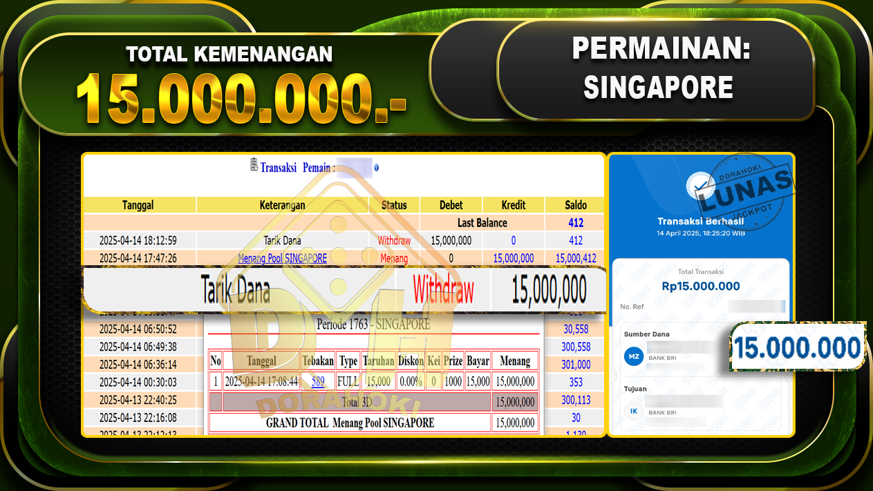 Bukti JP TOGEL SINGAPORE – ucapkan selamat kepada user id Sahxxx atas kemenangan di TOGEL SINGAPORE dengan total kemenangan Rp.15.000.000,- . Yang pasti nya langsung LUNAS sesuai bukti ya bosku. Dorahoki nih bosku berapapun akan tetap kami bayar lunas ya bosku.
