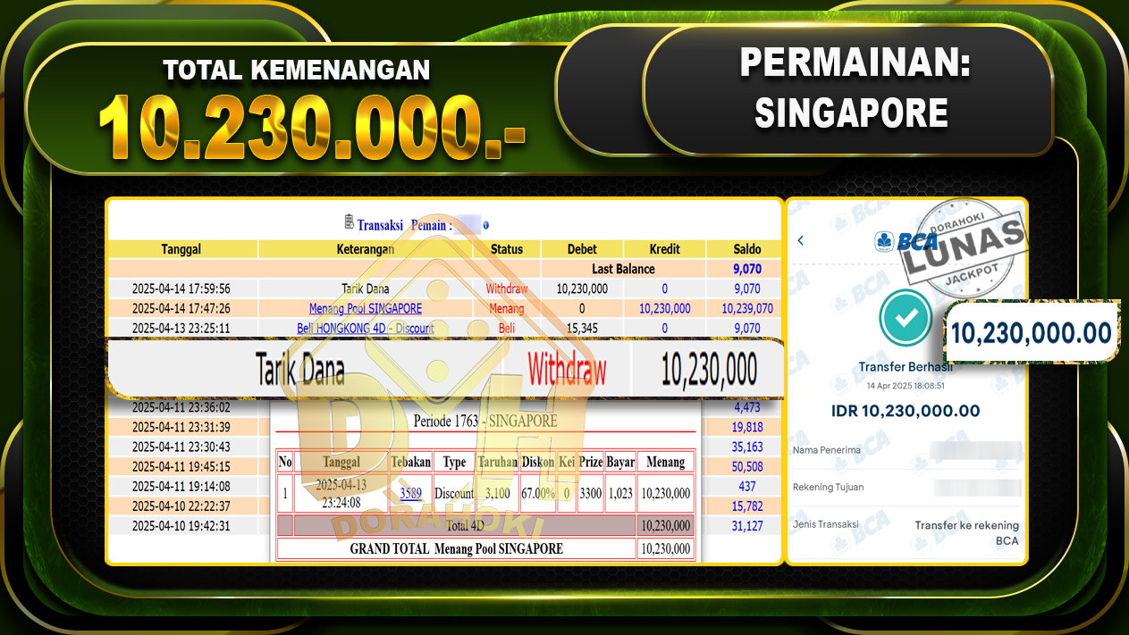 Bukti JP TOGEL SINGAPORE – ucapkan selamat kepada user id Zelxxx atas kemenangan di TOGEL SINGAPORE dengan total kemenangan Rp.10.230.000,- . Yang pasti nya langsung LUNAS sesuai bukti ya bosku. Dorahoki nih bosku berapapun akan tetap kami bayar lunas ya bosku.
