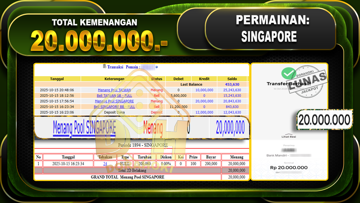 Bukti JP TOGEL SINGAPORE – ucapkan selamat kepada user id gulxxxxxx atas kemenangan di  TOGEL SINGAPORE dengan total kemenangan Rp.20,000,000,- Yang pasti nya langsung LUNAS sesuai bukti ya bosku. Dorahoki nih bosku berapapun akan tetap kami bayar lunas ya bosku