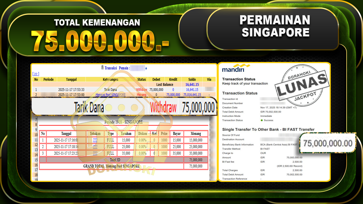 Bukti JP TOGEL SINGAPORE – ucapkan selamat kepada user id invxxxxx atas kemenangan di TOGEL SINGAPORE dengan total kemenangan Rp.75,000,000,- Yang pasti nya langsung LUNAS sesuai bukti ya bosku. Dorahoki nih bosku berapapun akan tetap kami bayar lunas ya bosku