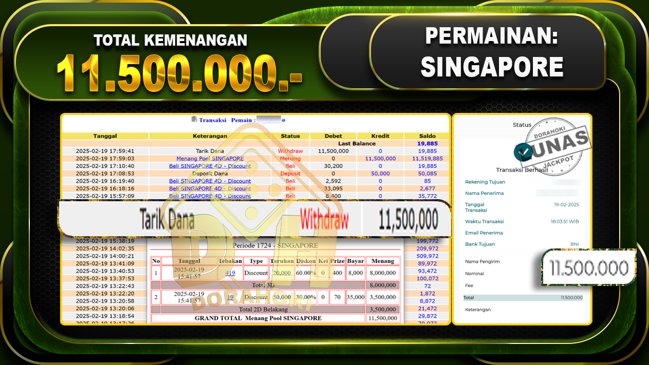 Bukti JP TOGEL SINGAPORE – ucapkan selamat kepada user id c4kxxx atas kemenangan di  TOGEL SINGAPORE  dengan total kemenangan Rp.11.500.000,- . Yang pasti nya langsung LUNAS sesuai bukti ya bosku. Dorahoki nih bosku berapapun akan tetap kami bayar lunas ya bosku.