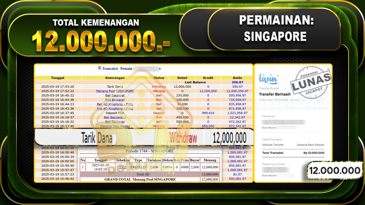 Bukti JP TOGEL SINGAPORE – ucapkan selamat kepada user id Budxxx atas kemenangan di TOGEL SINGAPORE dengan total kemenangan Rp.12.000.000,- . Yang pasti nya langsung LUNAS sesuai bukti ya bosku. Dorahoki nih bosku berapapun akan tetap kami bayar lunas ya bosku.