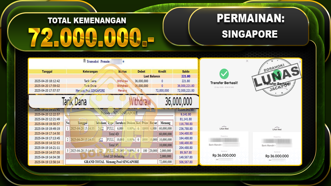 Bukti JP TOGEL SINGAPORE – ucapkan selamat kepada user id Lanxxx atas kemenangan di TOGEL SINGAPORE dengan total kemenangan Rp.72.000.000,- . Yang pasti nya langsung LUNAS sesuai bukti ya bosku. Dorahoki nih bosku berapapun akan tetap kami bayar lunas ya bosku.