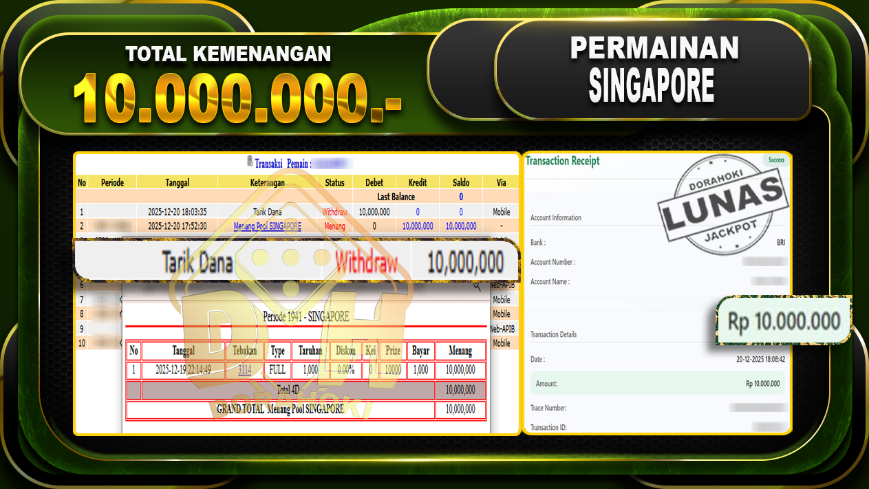 Bukti JP TOGEL SINGAPORE- Yang kami berikan ini sah dan real tanpa di rekayasa bosku dan hanya bertujuan untuk meningkatkan kepercayaan member kami dan memberikan kenyamanan saat bermain jadi bosku tidak perlu khawatir MENANG BERAPAPUN PASTI KAMI BAYAR LUNAS!!