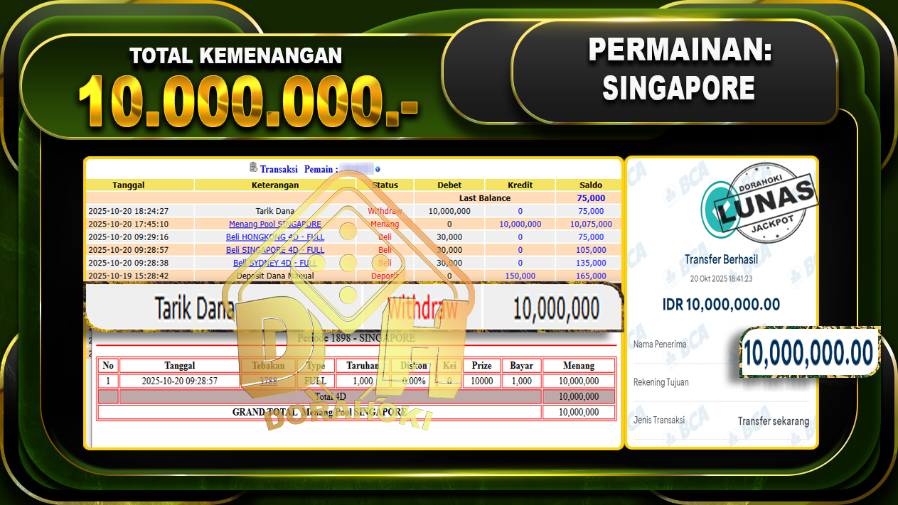 Bukti JP TOGEL SINGAPORE – ucapkan selamat kepada user id rimxxxx atas kemenangan di TOGEL SINGAPORE dengan total kemenangan Rp.10,000,000,- Yang pasti nya langsung LUNAS sesuai bukti ya bosku. Dorahoki nih bosku berapapun akan tetap kami bayar lunas ya bosku