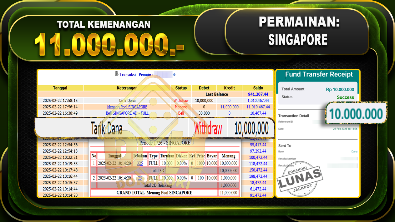 Bukti JP TOGEL SINGAPORE – ucapkan selamat kepada user id jacksexxx atas kemenangan di  TOGEL SINGAPORE  dengan total kemenangan Rp.11.000.000,- . Yang pasti nya langsung LUNAS sesuai bukti ya bosku. Dorahoki nih bosku berapapun akan tetap kami bayar lunas ya bosku.