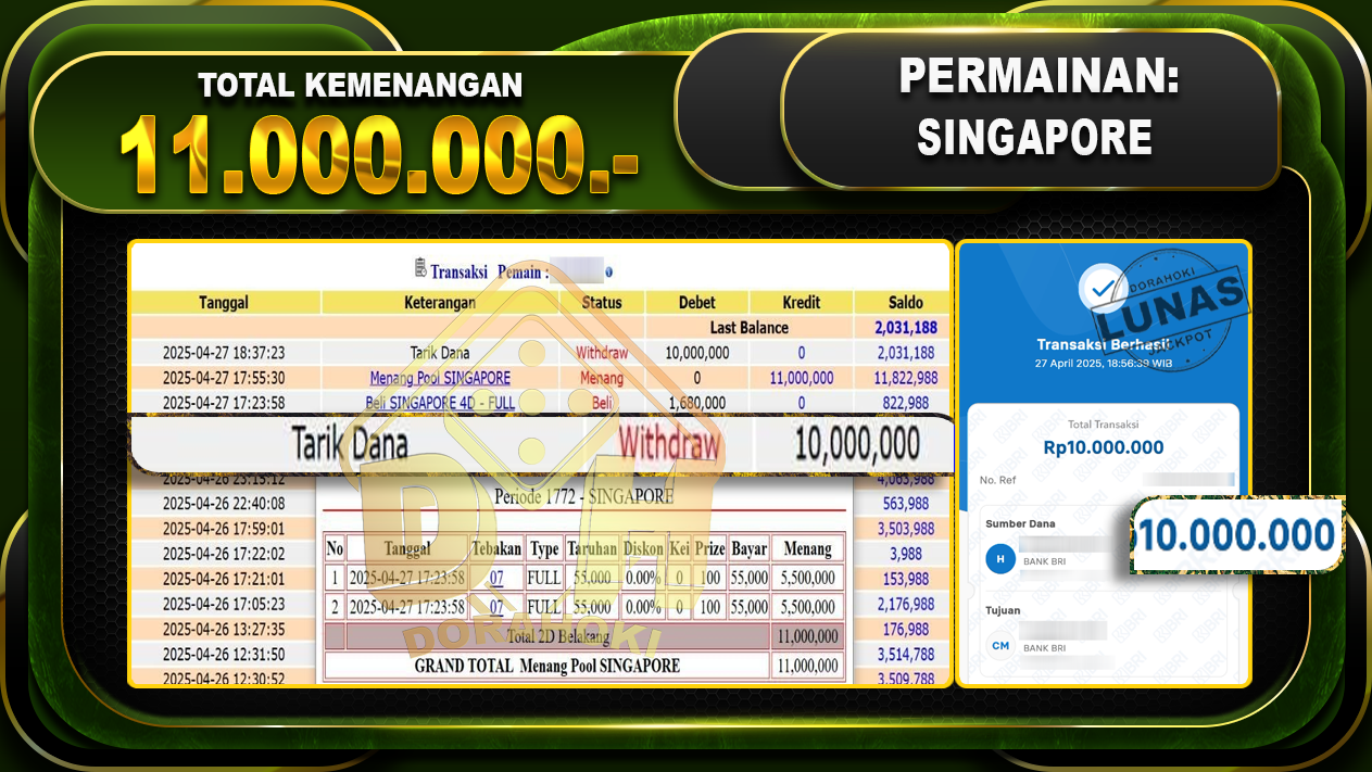 Bukti JP TOGEL SINGAPORE – ucapkan selamat kepada user id Lioxxx atas kemenangan di TOGEL SINGAPORE dengan total kemenangan Rp.11.000.000,- . Yang pasti nya langsung LUNAS sesuai bukti ya bosku. Dorahoki nih bosku berapapun akan tetap kami bayar lunas ya bosku.