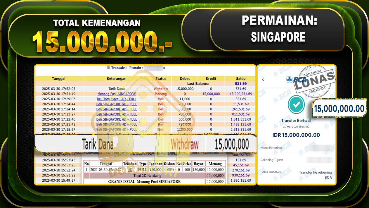 Bukti JP TOGEL SINGAPORE – ucapkan selamat kepada user id Tuhxxx atas kemenangan di TOGEL SINGAPORE dengan total kemenangan Rp.15.000.000,- . Yang pasti nya langsung LUNAS sesuai bukti ya bosku. Dorahoki nih bosku berapapun akan tetap kami bayar lunas ya bosku.