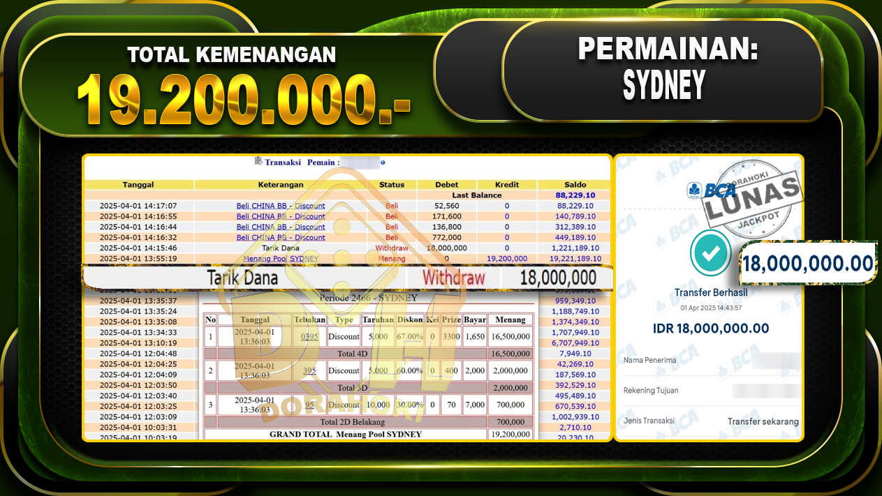 Bukti JP TOGEL SYDNEY – ucapkan selamat kepada user id Thexxx atas kemenangan di TOGEL SYDNEY dengan total kemenangan Rp.19.200.000,- . Yang pasti nya langsung LUNAS sesuai bukti ya bosku. Dorahoki nih bosku berapapun akan tetap kami bayar lunas ya bosku.