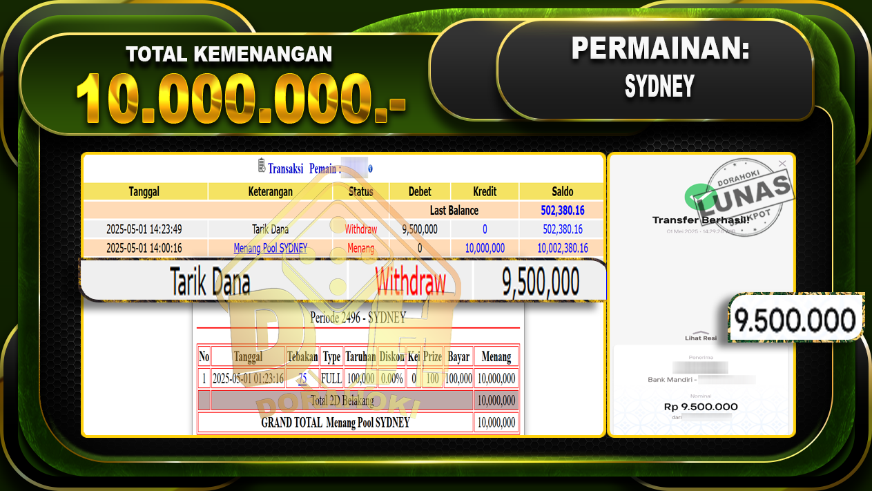 Bukti JP TOGEL SYDNEY – ucapkan selamat kepada user id Kikxxx atas kemenangan di  TOGEL SYDNEY  dengan total kemenangan Rp.10.000.000,- . Yang pasti nya langsung LUNAS sesuai bukti ya bosku. Dorahoki nih bosku berapapun akan tetap kami bayar lunas ya bosku.