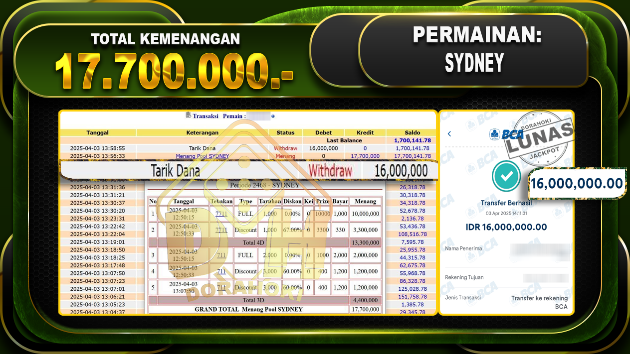 Bukti JP TOGEL SYDNEY – ucapkan selamat kepada user id Gabxxx atas kemenangan di TOGEL SYDNEY dengan total kemenangan Rp.17.700.000,- . Yang pasti nya langsung LUNAS sesuai bukti ya bosku. Dorahoki nih bosku berapapun akan tetap kami bayar lunas ya bosku.