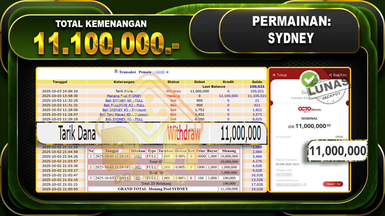 Bukti JP TOGEL SYDNEY – ucapkan selamat kepada user id yusxxxx atas kemenangan di  TOGEL SYDNEY dengan total kemenangan Rp.11,100,000,- Yang pasti nya langsung LUNAS sesuai bukti ya bosku. Dorahoki nih bosku berapapun akan tetap kami bayar lunas ya bosku