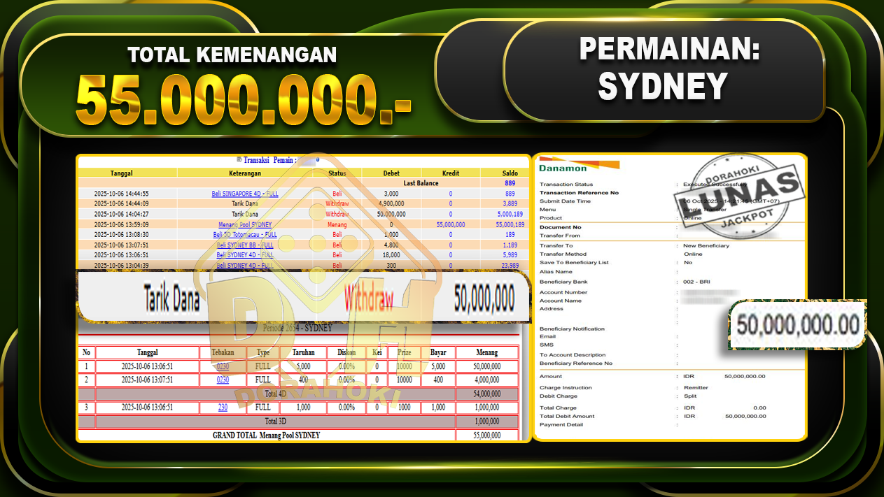 Bukti JP TOGEL SYDNEY – ucapkan selamat kepada user id lomxxx atas kemenangan di  TOGEL SYDNEY dengan total kemenangan Rp.55,000,000,- Yang pasti nya langsung LUNAS sesuai bukti ya bosku. Dorahoki nih bosku berapapun akan tetap kami bayar lunas ya bosku