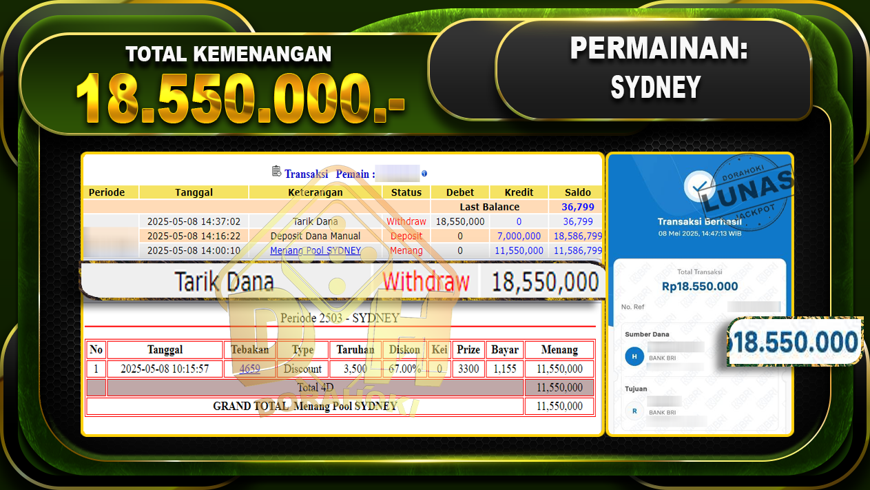 Bukti JP TOGEL SYDNEY – ucapkan selamat kepada user id Nalxxx atas kemenangan di TOGEL SYDNEY dengan total kemenangan Rp.18.550.000,- . Yang pasti nya langsung LUNAS sesuai bukti ya bosku. Dorahoki nih bosku berapapun akan tetap kami bayar lunas ya bosku.