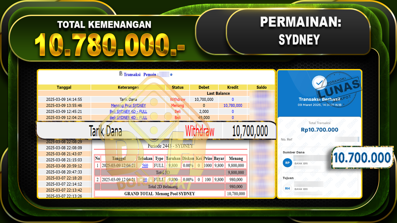 Bukti JP TOGEL SYDNEY – ucapkan selamat kepada user id Fatxxx atas kemenangan di TOGEL SYDNEY dengan total kemenangan Rp.10.780.000,- . Yang pasti nya langsung LUNAS sesuai bukti ya bosku. Dorahoki nih bosku berapapun akan tetap kami bayar lunas ya bosku.
